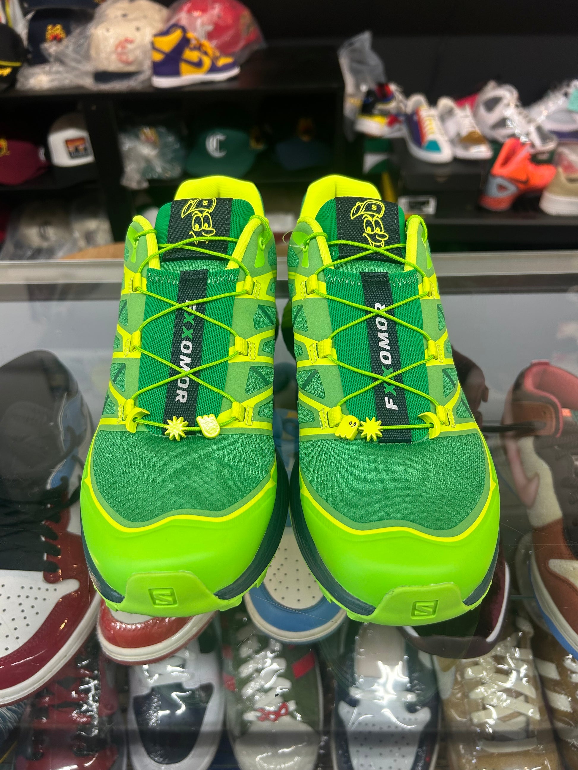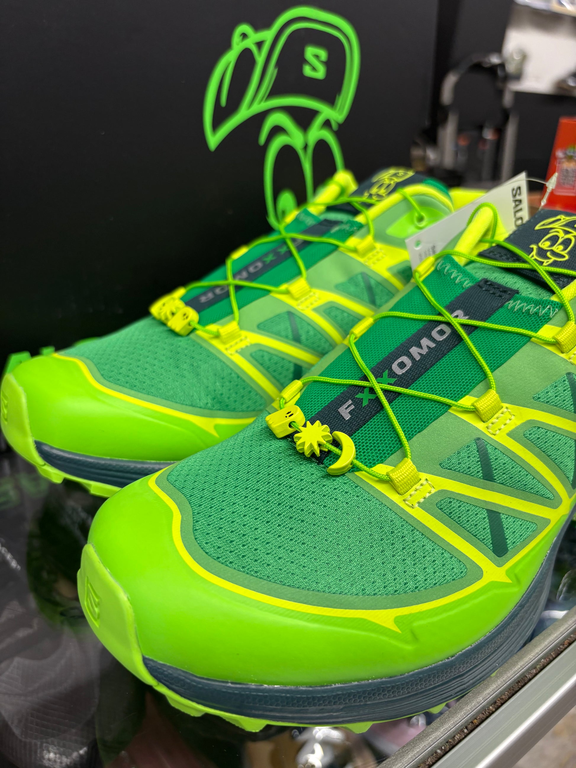 Debuting during Feid’s 2025 Governor’s Ball set, the Feid x Salomon XT-Pathway 2-FXXOMOR captured the attention of fans and onlookers alike! The Colombian singer’s vibe can be felt throughout those shoe. Featuring a vibrant green breathable mesh upper fused with yellow-green (lime) TPUoverlays, this sneaker is lightweight and durable all at the same time. The outsole is the traditional trail outsole in corresponding green and lime green split. The Feid graphic adorns the tongue, insole and box, as well as the “FXXOMOR” branding on the center ribbon that runs down the tongue. Rounding out this fire shoe are the charms that are lace dubraes on the string like adjustable laces. Needless to say this sneaker with its varying greens is the perfect shoe for any season and will level up any fit!