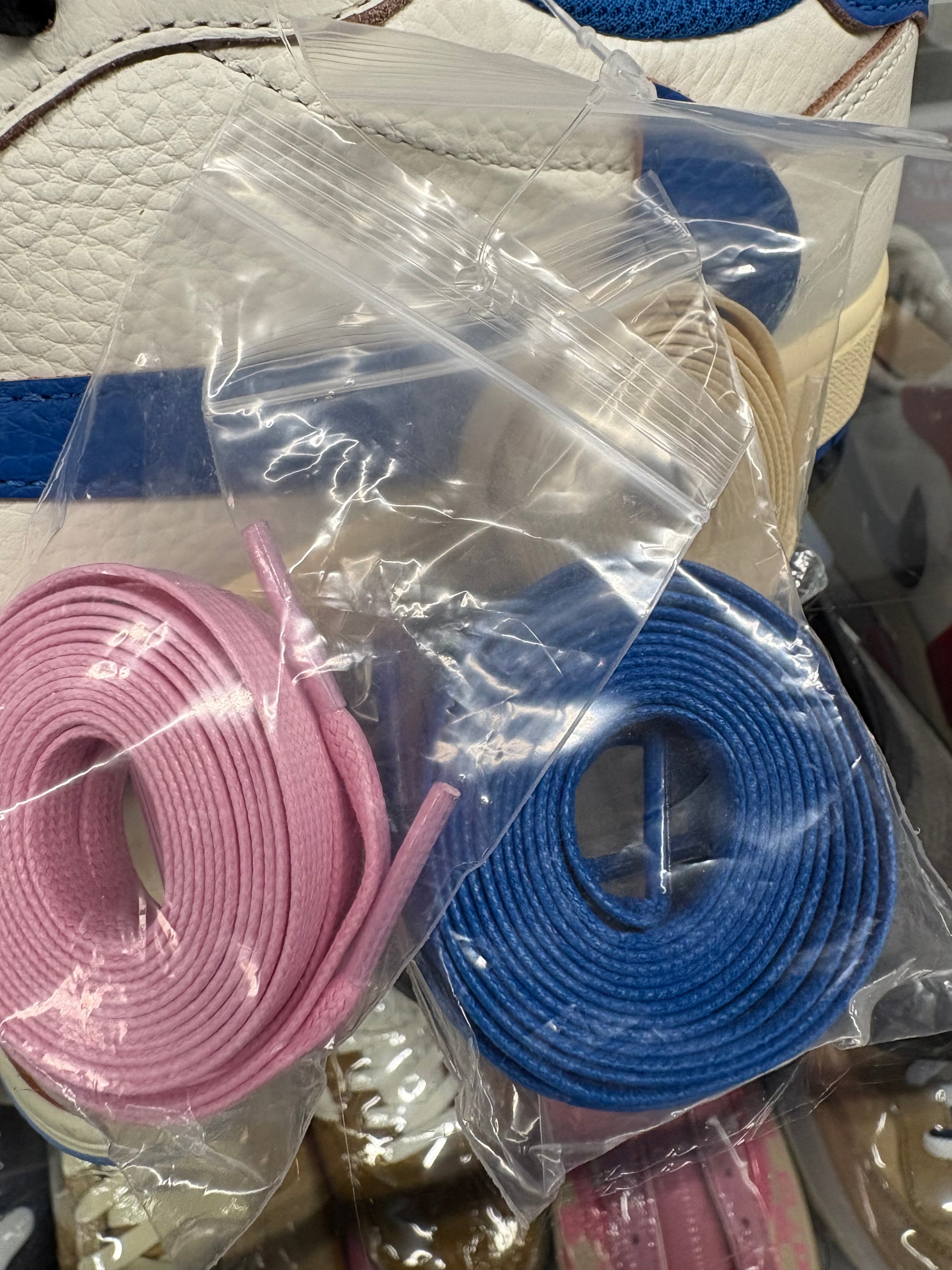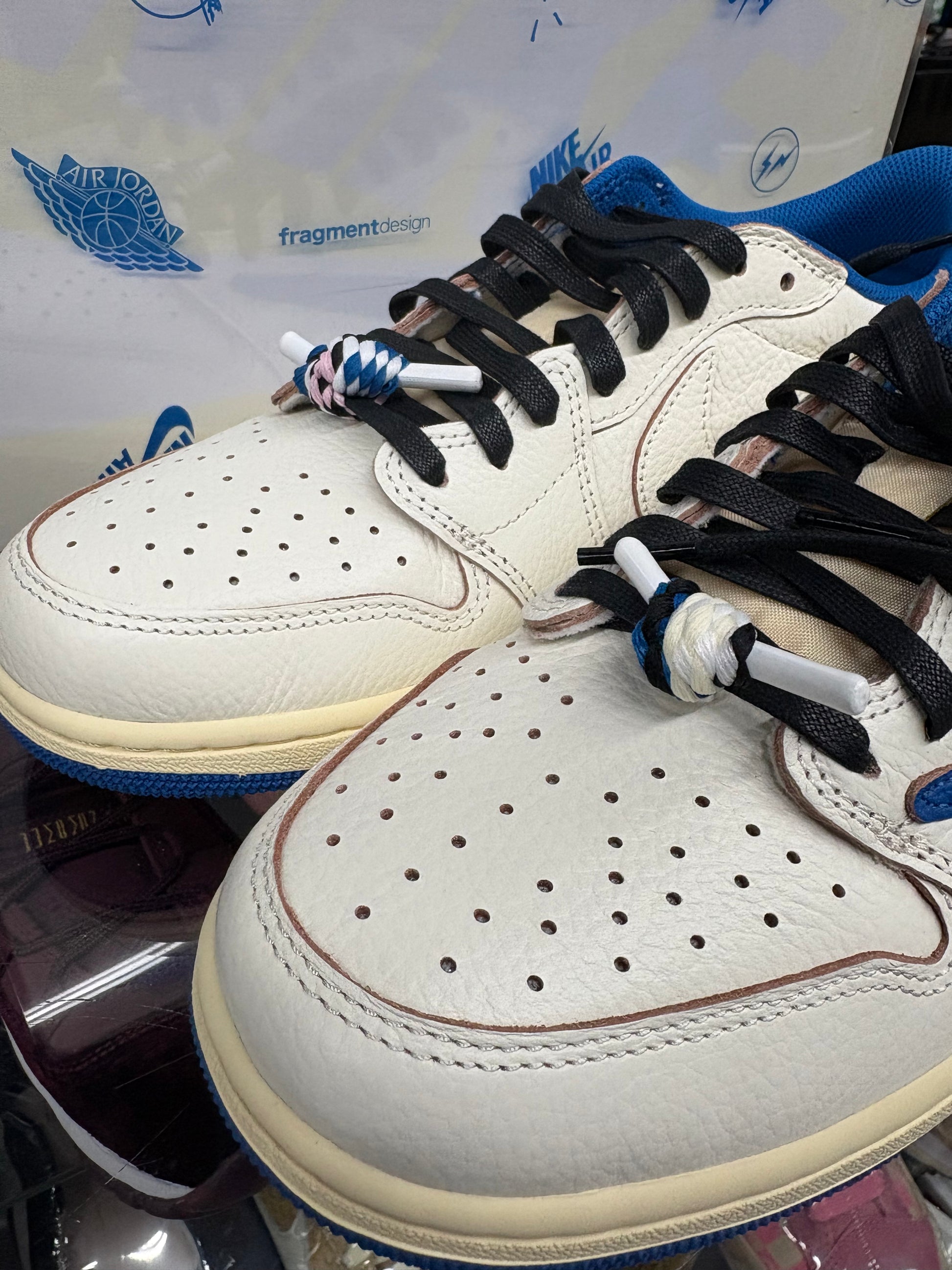 Rumored to be the final entry in the Travis Scott and Jordan Brand relationship, the Travis Scott x Fragment Design x AJ1 Low OG (2025) brings a fresh and clean look to the classic silhouette. Featuring an all cream upper with matching overlays, this sneaker has a quality leather material that elevates typical AJ1 Lows. The now iconic “Fragment blue” can be seen on the lateral side of the shoe in the large reverse Swoosh logo made popular (not originated) by Travis Scott through other Nike and Jordan Brand models. This same blue can be seen in the inner sock liner and heel tabs that don the Air Jordan Wings logo on one heel tab and the Cactus Jack logo on the other in white embroidery. Rounding out the heel is the Cactus Jack smiley and the Fragment logos embossed under the heel tabs. The TS Fragment 1 Low OG (2025) sits atop an aged midsole and Fragment blue outsole for the perfect amount of color pop that is subtle and eye catching at the same time. Coming pre-laced with Black laces, this simple sneaker comes with 3 additional lace swap options for wearers to put their own touch on the sneaker. Needless to say, this sneaker will turn heads this full and definitely next spring due to its cool clean look. Each sneaker has a lace lock, rather lace tie, that features the color of the shoe itself self and adds additional character to a sneaker that could potentially rival its predecessor. This is a must-have for any rotation!